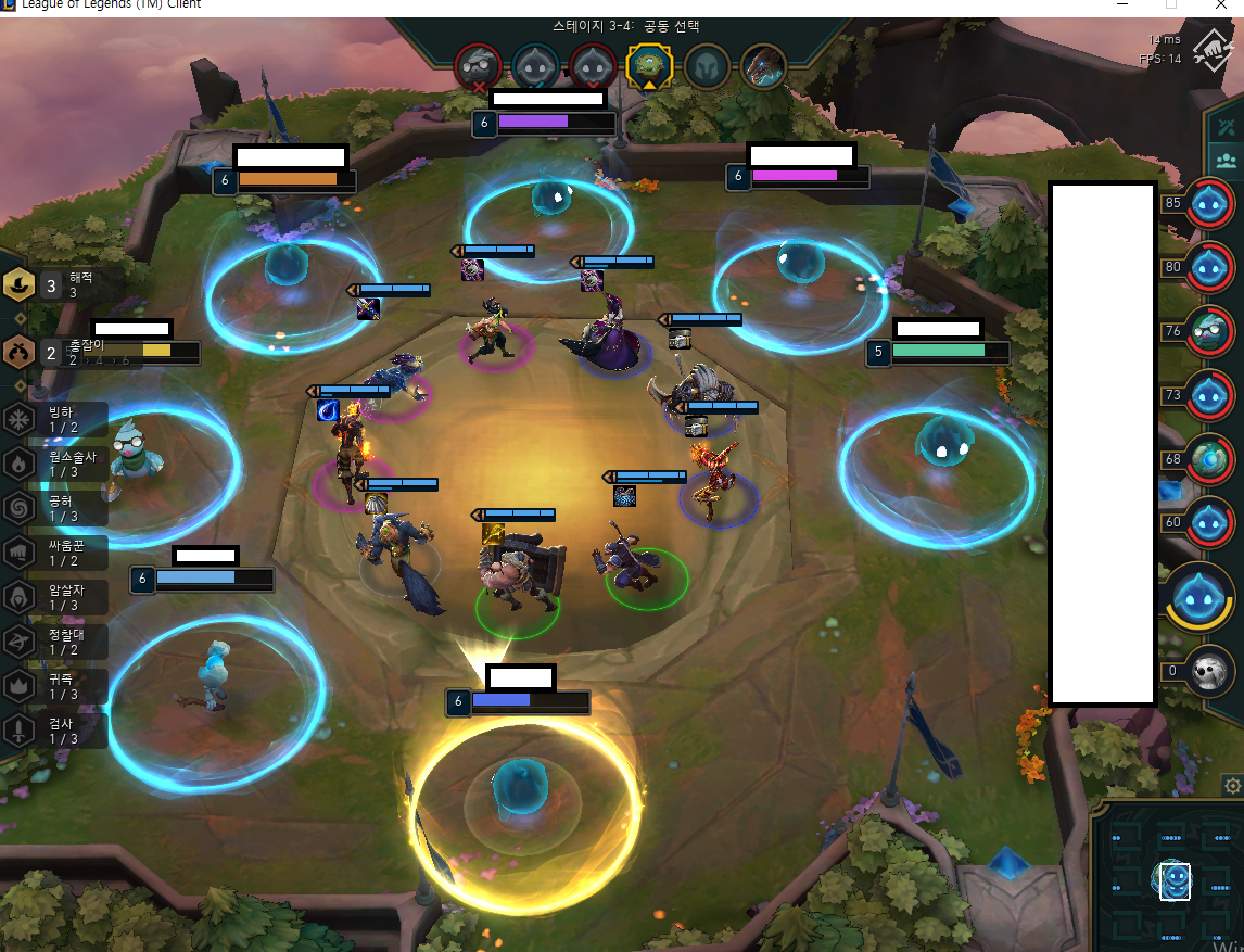 참고로 픽할 때의 화면은 다음과 같습니다. 현재 순위가 낮은 순서부터 2명씩 원하는 챔피언을 가져갑니다. 여기서 어떤 챔피언을 선택하느냐가 이후 나의 덱구성(챔피언구성)과 나아가 승패를 좌우하게 되니 잘 판단하셔야 합니다!